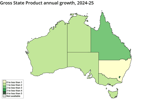Cơ quan thống kê Úc (ABS) vừa công bố số liệu cho thấy, tất cả các tiểu bang/vùng lãnh thổ của Úc trong năm 2024-25 đều ghi nhận tăng trưởng dương với mức trung bình toàn Úc đạt 1,4%.
