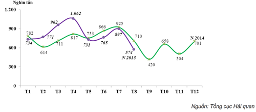 Đơn giá nhập khẩu bình quân trong tháng 8 giảm 17,2% so với tháng trước. Theo đó, trị giá nhập khẩu là 258 triệu USD, giảm 47% so với tháng trước.
