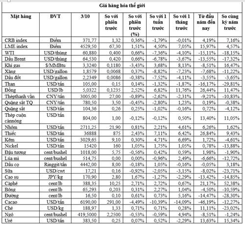 Kết thúc phiên 3/10, giá dầu thô Brent tăng 42 cent, tương đương 0,7%, lên 64,53 USD/thùng, trong khi giá dầu thô ngọt nhẹ West Texas Intermediate của Mỹ tăng 40 cent, tương đương 0,7%, lên 60,88 USD.