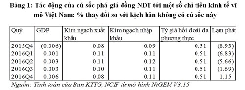 Từ đó, tăng trưởng kinh tế của Việt Nam giảm đi 0,006% trong quý IV/2015 và tăng thêm 0,003% trong năm 2016. Với cú sốc này, tiền đồng tăng giá 0,5%. Lạm phát của Việt Nam giảm 8,9% trong quý IV/2015 và 3,1% trong năm 2016 so với kịch bản không có cú sốc.