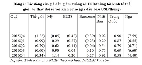 Kịch bản thứ hai, khi giá dầu của thế giới giảm xuống mức 40 USD/thùng. Trường hợp này, kinh tế của các nước xuất khẩu dầu mỏ lớn suy giảm nghiêm trọng nên chi tiêu chính phủ và tổng cầu trong nước của các quốc gia này giảm mạnh kéo theo cầu hàng hóa của các quốc gia này từ các nền kinh tế phát triển giảm khiến cho kinh tế của các nước chịu tác động tiêu cực với các mức độ khác nhau theo mức độ phụ thuộc lẫn nhau.