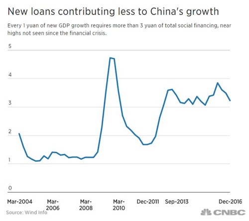 Phân tích từ tổ chức dữ liệu tài chính Wind Information cho thấy tính đến tháng 12, mỗi đồng NDT của GDP cần hơn 3 đồng trong tổng cho vay đầu tư xã hội, gần với mức thời khủng hoảng tài chính.