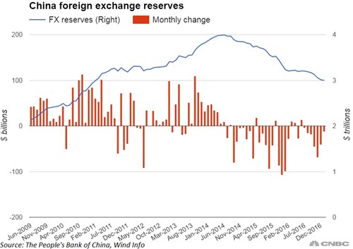 Tương tự, dự trữ ngoại hối chính thức giảm với tốc độ chậm hơn trong tháng 1, nhưng đã giảm xuống mức quan trọng 3.000 tỉ đô, đánh dấu mức giảm 1.000 tỉ đô trong 2,5 năm.
