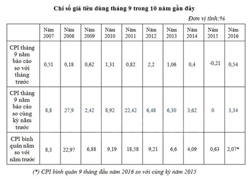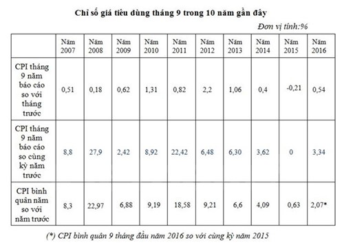 Song mặt khác, việc CPI 9 tháng tăng 2,07% so với cùng kỳ năm 2015 nên tính bình quân mỗi tháng CPI chỉ tăng 0,34%. Theo bà Ngọc, từ nay đến hết năm vẫn có nhiều yếu tố gây áp lực lên CPI, đó là giá dịch vụ y tế, giá xăng dầu, chi tiêu dùng cuối năm...