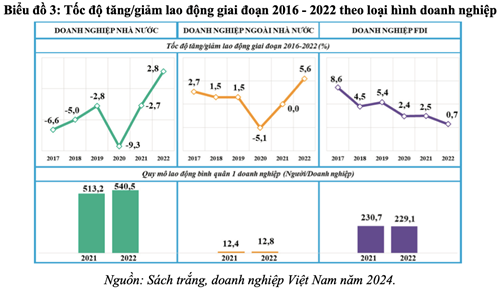 Tốc độ tăng trưởng số lao động trong khu vực kinh tế tư nhân giai đoạn 2011 – 2018 đạt trung bình trên 3,6% mỗi năm; riêng khu vực doanh nghiệp tư nhân đạt gần 5,4%, cho thấy xu hướng mở rộng liên tục. Năm 2022, khu vực doanh nghiệp ngoài nhà nước đã thu hút khoảng 9,1 triệu lao động, chiếm 59,2% tổng số lao động làm việc trong các doanh nghiệp, tăng 5,6% so với cùng kỳ năm 2021. Tuy nhiên, phần lớn các doanh nghiệp này thuộc loại hình siêu nhỏ và nhỏ, với quy mô lao động bình quân chỉ đạt 12,8 người/doanh nghiệp, phản ánh thách thức trong việc nâng cao năng suất và năng lực cạnh tranh.