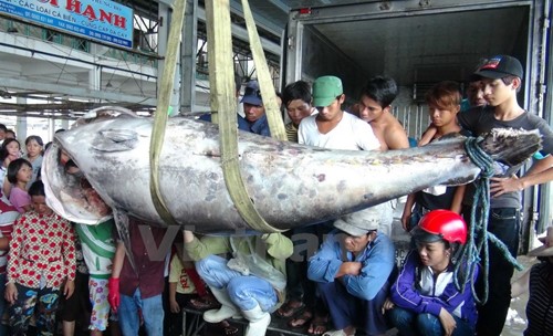 Sau gần 1 giờ đưa tàu cập cảng cá Hòn Rớ, chủ tàu cá KH 90297-TS Huỳnh Phi Minh, trú ở xã Phước Đồng, thành phố Nha Trang, tỉnh Khánh Hòa đã dùng cần cẩu đưa được con cá ngừ vây xanh nặng 307 kg lên bến cảng để cân và bán với giá 180.000 đồng/kg (trong khi giá cá ngừ đại dương đang ở mức 90.000 đồng/kg).
