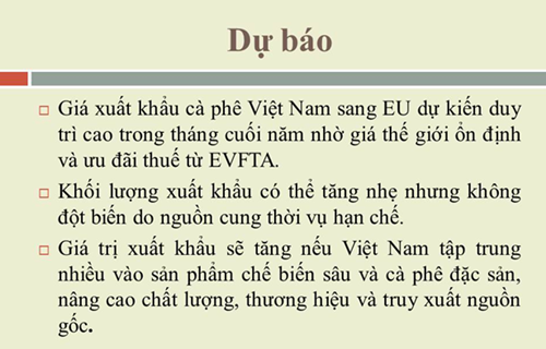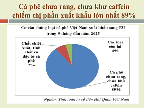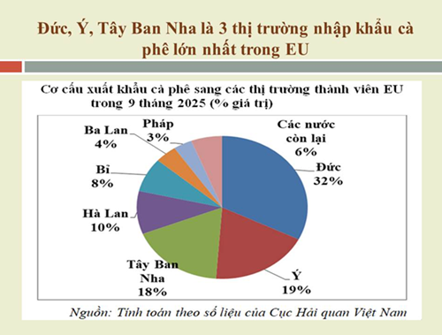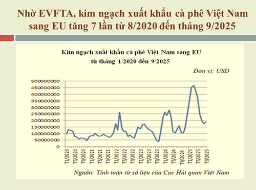 Tính chung 9 tháng đầu năm 2025, xuất khẩu cà phê của Việt Nam sang EU đạt hơn 516,5 nghìn tấn, trị giá 2.913,7triệu USD, tăng 19,5% về lượng song tăng 74,29% về giá trị so với cùng kỳ năm 2024. Tỷ trọng xuất khẩu cà phê của Việt Nam sang EU chiếm 40,8% tổng kim ngạch xuất khẩu mặt hàng này của cả nước trong tháng 9/2025 và chiếm 41,5% trong 9 tháng đầu năm. Tỷ trọng này đã tăng hơn mức lần lượt 36% và 38% của năm ngoái. Như vậy thị phần xuất khẩu cà phê Việt Nam sang EU trong tổng xuất khẩu cà phê của nước ta đã tăng cao hơn nhờ EVFTA.
