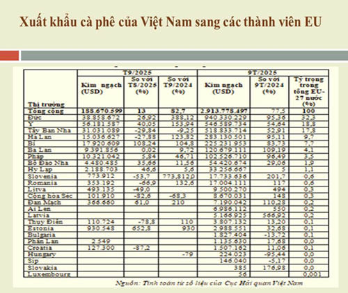 Theo tính toán từ số liệu thống kê từ Cục Hải quan Việt Nam, trong tháng 9/2025, xuất khẩu cà phê của Việt Nam sang EU đạt 35.591 tấn, trị giá hơn 188,6 triệu USD; tăng 6,2% về lượng và tăng 9,7% về giá trị so với tháng liền trước; So với cùng kỳ năm ngoái tăng 93,7% về lượng và tăng 81% về giá trị.