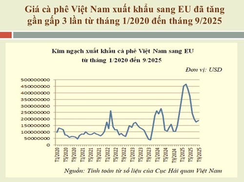 Hiệp định Thương mại Tự do Việt Nam – EU (EVFTA), có hiệu lực từ tháng 8/2020, đã tạo cú hích quan trọng cho xuất khẩu cà phê Việt Nam sang EU. Theo số liệu từ Cục Hải quan Việt Nam, từ kim ngạch chỉ 64 triệu USD vào tháng 8/2020, xuất khẩu cà phê sang EU đã tăng gấp 7,2 lần, đạt mức cao nhất là 466 triệu USD vào tháng 3/2025. Sau đó, xuất khẩu đã liên tục giảm xuống so với tháng liền trước trong thời gian từ tháng 4/2025 đến tháng 8/2025 do nguồn cung cuối vụ hạn chế, chủ yếu phụ thuộc vào kho dự trữ vì vụ mùa mới chưa tới. Sang tháng 9/2025, xuất khẩu đã bật tăng mạnh.