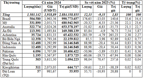 Tính chung cả năm 2024 nhập khẩu nhóm hàng này đạt 1,5 triệu tấn, tương đương 2,88 tỷ USD, tăng 12,3% về lượng và tăng 1,8% về kim ngạch so với năm 2023. Giá trung bình đạt 1.919 USD/tấn, giảm 9,4% so với năm 2023.