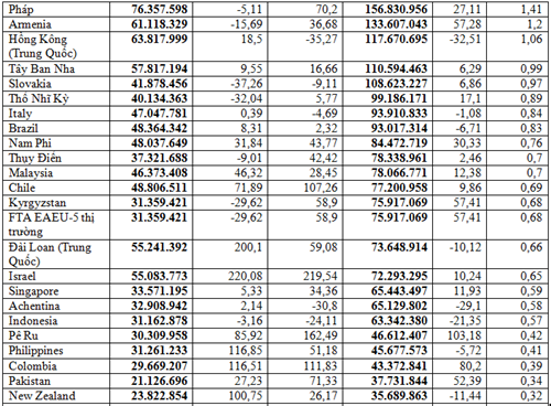 Tiếp đến thị trường Hàn Quốc đạt trên 1,11 tỷ USD, chiếm tỷ trọng 9,98%, tăng mạnh 118,39% so với 2 tháng đầu năm 2025, xuất khẩu sang thị trường U.A.E đạt trên 594,14 triệu USD, tăng 10,65%, chiếm 5,33%; thị trường Nhật Bản đạt 449,47 triệu USD, tăng 42,22%, chiếm 4,03%.