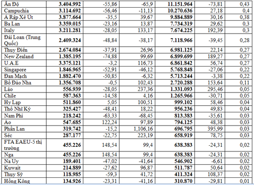 Tiếp sau đó là các thị trường cũng đạt kim ngạch cao như: Nhật Bản đạt 349,49 triệu USD, chiếm 13,52%, tăng 8,06%; Hàn Quốc 95,24 triệu USD, chiếm 3,68%, giảm 20,3%. Xuất khẩu gỗ và sản phẩm gỗ sang thị trường Canada đạt 47,53 triệu USD, chiếm 1,84%, tăng 8,69%; Xuất khẩu sang thị trường Anh đạt 45,43 triệu USD, chiếm 1,76%, tăng 15,51%