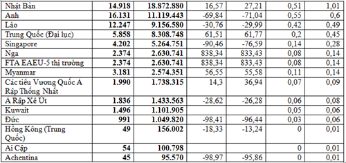 Tiếp đến thị trường Campuchia chiếm 13,44% trong tổng lượng và chiếm 12,02% trong tổng kim ngạch, đạt 395.763 tấn, tương đương 223,71 triệu USD, giá 565,27 USD/tấn, tăng 6,81% về lượng, tăng 5,88% kim ngạch nhưng giảm 0,86% về giá so với quý I/2025.