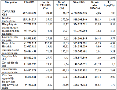 Riêng tháng 12/2025 kim ngạch nhập khẩu tăng 28,39% so với tháng 11/2025, đạt trên 697,56 triệu USD nhưng tăng 29,4% so với tháng 12/2024.
