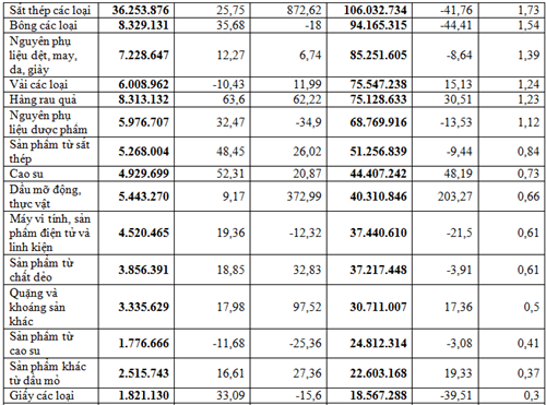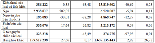 Tiếp đến nhóm hàng Máy móc, thiết bị, dụng cụ, phụ tùng đạt gần 497,71 triệu USD, chiếm 8,1%, giảm 7,8%; Linh kiện, phụ tùng ô tô đạt 354,1 triệu USD, chiếm 5,8% trong tổng kim ngạch, giảm 16,4%.