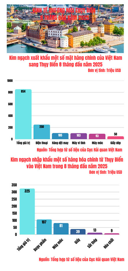 Theo số liệu của Cục Hải quan Việt Nam, trong 8 tháng đầu năm 2025, kim ngạch xuất khẩu hàng hóa của Việt Nam sang Thụy Điển đạt hơn 854,41 triệu USD, tăng mạnh 24,65% so với 8 tháng đầu năm 2024. Trong đó, điện thoại các loại và linh kiện là mặt hàng xuất khẩu lớn nhất với kim ngạch hơn 250,164 triệu USD, tăng 5,08% so với cùng kỳ năm 2024, tiếp theo là hàng dệt may đạt 105,195 triệu USD, tăng 59,88%; máy vi tính, sản phẩm điện tử và linh kiện hơn 103,809 triệu USD, tăng 61,29%.