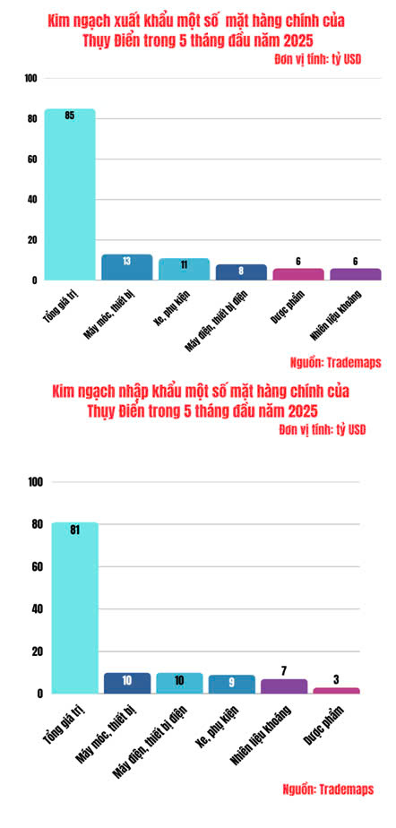 Theo số liệu của Trung tâm Thương mại Quốc tế (ITC) của WTO, tổng kim ngạch xuất khẩu hàng hóa của Thụy Điển trong 5 tháng đầu năm 2025 đạt hơn 85,711 tỷ USD, giảm 1,73 % so với cùng kỳ năm 2024. Kim ngạch nhập khẩu của Thụy Điển đạt mức hơn 80,957 tỷ USD, tăng 1,69% so với mức 79,608 tỷ USD trong 5 tháng đầu năm 2024. Các nước đối tác thương mại chính của Thụy Điển là các nước thành viên EU, Trung Quốc, Mỹ, Anh, Nhật Bản, Hàn Quốc, Australia, Ấn Độ.