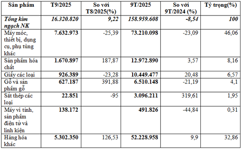Riêng tháng 9/2025 kim ngạch đạt trên 16,32 triệu USD, tăng 9,22% so với tháng 8/2025 nhưng giảm 33,17% so với tháng 9/2024.