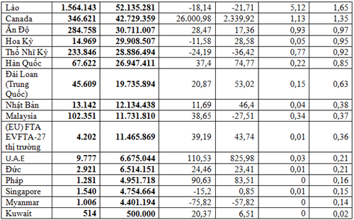 Australia và Brazil vẫn là 2 thị trường chủ đạo cung cấp quặng và khoáng sản cho Việt Nam, riêng 2 thị trường này đã chiếm 66,5% trong tổng kim ngạch nhập khẩu quặng và khoáng sản của cả nước; trong đó nhập khẩu từ thị trường Australia đạt 12,61 triệu tấn, tương đương 1,25 tỷ USD, tăng 9,9% về lượng nhưng giảm 1,3% về kim ngạch; giá nhập khẩu đạt 99,2 USD/tấn, giảm 10,2%.