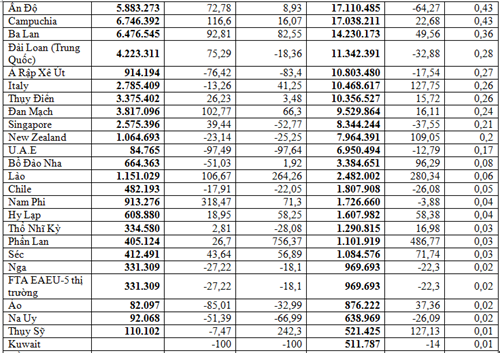 Tiếp sau đó là các thị trường cũng đạt kim ngạch cao như: Nhật Bản đạt 539,64 triệu USD, chiếm 13,53%, tăng 5,61%; Hàn Quốc 148,33 triệu USD, chiếm 3,72%, giảm 20,53%.