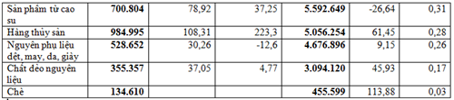 Xuất khẩu nhóm hàng sắt thép đạt 71,72 triệu USD, chiếm 3,96%, giảm mạnh 55,59%. Hàng dệt, may đạt 53,42 triệu USD, chiếm 2,95%, tăng nhẹ 3,5%.