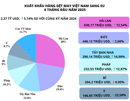 Trong số các đối tác trong EVFTA, hiện Việt Nam xuất hàng dệt may nhiều nhất sang các thị trường là: Hà Lan gần 636,17 triệu USD, Đức đạt gần 446,12 triệu USD trong 6 tháng đầu năm 2025.