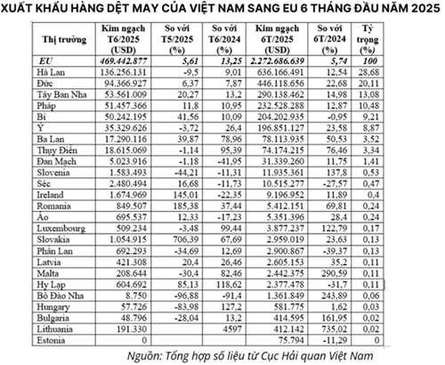 Xuất khẩu hàng dệt may của Việt Nam sang EU tháng 6/2025 tăng 5,61% so với tháng 5/2025 và tăng 13,25% so với tháng 6/2024, đạt trên 469,44 triệu USD. Tính chung 6 tháng đầu năm 2025 đạt trên 2,72 tỷ USD, tăng 5,74% so với cùng kỳ năm 2024; chiếm 12,17% trong tổng kim ngạch xuất khẩu hàng dệt may ra toàn thế giới.