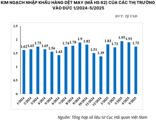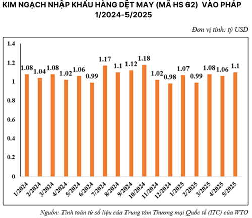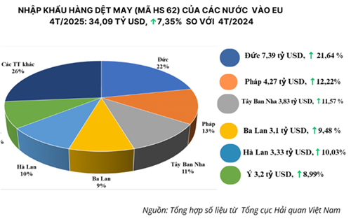 Theo tính toán từ số liệu của Trung tâm Thương mại Quốc tế (ITC) của WTO, trong 4 tháng đầu năm 2025 nhập khẩu hàng may mặc mã HS 61 (các loại quần áo và hàng may mặc phụ trợ, dệt kim hoặc móc) vào thị trường EU đứng đầu về kim ngạch đạt 33,89 tỷ USD, tăng 9,82% so với cùng kỳ năm 2024; Mã HS62 (các loại quần áo và các hàng may mặc phụ trợ, không dệt kim hoặc móc) đứng thứ 2 về kim ngạch đạt trên 34,09 tỷ USD, tăng 7,35% so với cùng kỳ năm 2024 và hầu hết các thị trường lớn sụt giảm kim ngạch nhập khẩu.