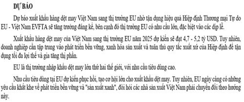 Dự báo, xuất khẩu hàng dệt may của Việt Nam sang thị trường EU sẽ tiếp tục tăng trưởng trong năm 2025, với kim ngạch có thể đạt 4,7 - 5,2 tỷ USD nhờ tận dụng hiệu quả Hiệp định Thương mại Tự do EU-Việt Nam (EVFTA).