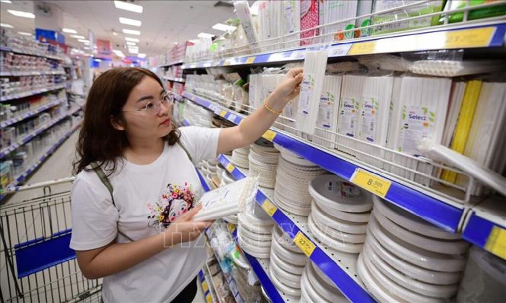 Người tiêu dùng TP. Hồ Chí Minh lựa chọn sản phẩm chất liệu tái chế, thân thiện tại siêu thị. Ảnh: Hương Giang/TTXVN